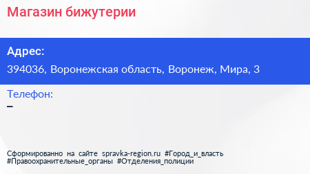 Магазин бижутерии по адресу 394036, Воронежская область, Воронеж, Мира, 3 в дальнейшем Организация, размещена в следующих категориях: