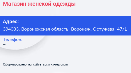 Магазин женской одежды по адресу 394033, Воронежская область, Воронеж, Остужева, 47/1 в дальнейшем Организация, размещена в следующих категориях: