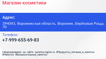 Магазин косметики по адресу 394043, Воронежская область, Воронеж, Берёзовая Роща, 70 в дальнейшем Организация, размещена в следующих категориях: