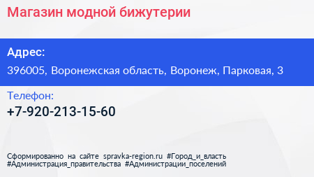 Магазин модной бижутерии по адресу 396005, Воронежская область, Воронеж, Парковая, 3 в дальнейшем Организация, размещена в следующих категориях: