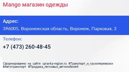 Mango, магазин одежды по адресу 396005, Воронежская область, Воронеж, Парковая, 3 в дальнейшем Организация, размещена в следующих категориях:
