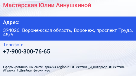 Мастерская Юлии Аннушкиной по адресу 394026, Воронежская область, Воронеж, проспект Труда, 48/5 в дальнейшем Организация, размещена в следующих категориях: