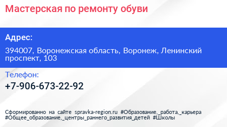 Мастерская по ремонту обуви по адресу 394007, Воронежская область, Воронеж, Ленинский проспект, 103 в дальнейшем Организация, размещена в следующих категориях: