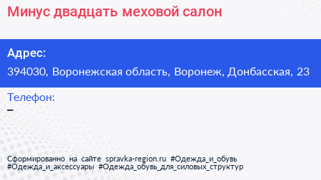 Минус двадцать, меховой салон по адресу 394030, Воронежская область, Воронеж, Донбасская, 23 в дальнейшем Организация, размещена в следующих категориях: