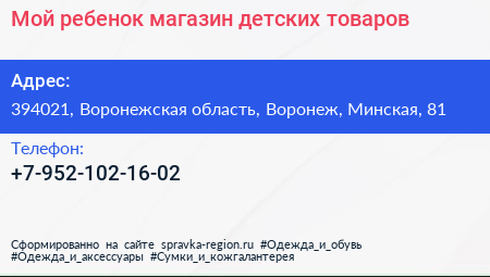 Мой ребенок, магазин детских товаров по адресу 394021, Воронежская область, Воронеж, Минская, 81 в дальнейшем Организация, размещена в следующих категориях: