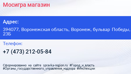 Мосигра, магазин по адресу 394077, Воронежская область, Воронеж, бульвар Победы, 23Б в дальнейшем Организация, размещена в следующих категориях: