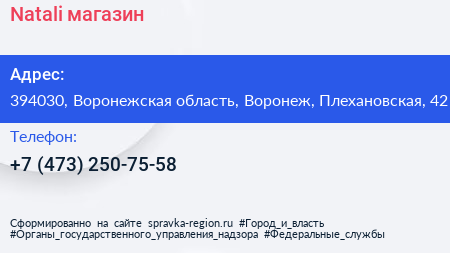 Natali, магазин по адресу 394030, Воронежская область, Воронеж, Плехановская, 42 в дальнейшем Организация, размещена в следующих категориях: