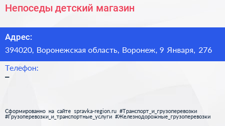 Непоседы, детский магазин по адресу 394020, Воронежская область, Воронеж, 9 Января, 276 в дальнейшем Организация, размещена в следующих категориях:
