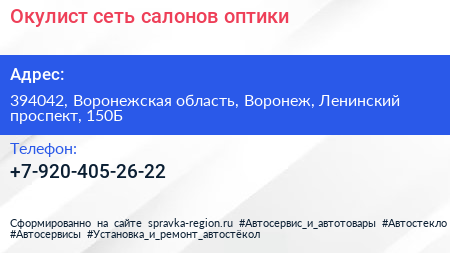 Окулист, сеть салонов оптики по адресу 394042, Воронежская область, Воронеж, Ленинский проспект, 150Б в дальнейшем Организация, размещена в следующих категориях: