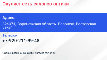 Окулист, сеть салонов оптики по адресу 394074, Воронежская область, Воронеж, Ростовская, 58/24 в дальнейшем Организация, размещена в следующих категориях: