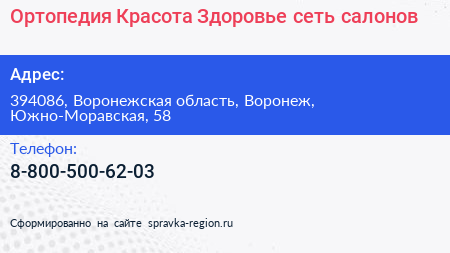 Ортопедия Красота Здоровье, сеть салонов по адресу 394086, Воронежская область, Воронеж, Южно-Моравская, 58 в дальнейшем Организация, размещена в следующих категориях: