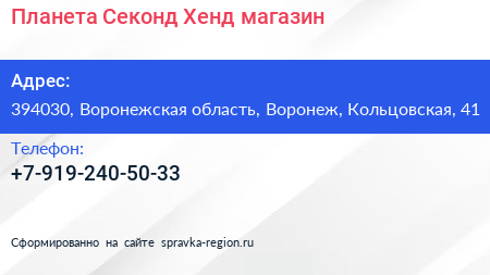 Планета Секонд-Хенд, магазин по адресу 394030, Воронежская область, Воронеж, Кольцовская, 41 в дальнейшем Организация, размещена в следующих категориях: