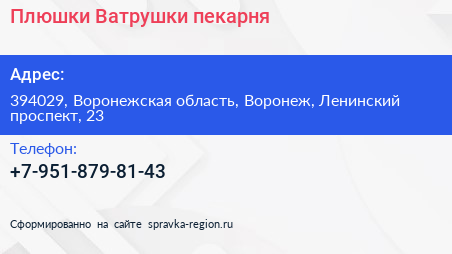 Плюшки Ватрушки, пекарня по адресу 394029, Воронежская область, Воронеж, Ленинский проспект, 23 в дальнейшем Организация, размещена в следующих категориях:
