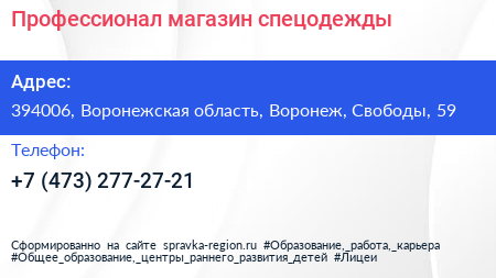 Профессионал, магазин спецодежды по адресу 394006, Воронежская область, Воронеж, Свободы, 59 в дальнейшем Организация, размещена в следующих категориях: