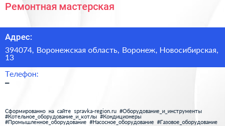 Ремонтная мастерская по адресу 394074, Воронежская область, Воронеж, Новосибирская, 13 в дальнейшем Организация, размещена в следующих категориях: