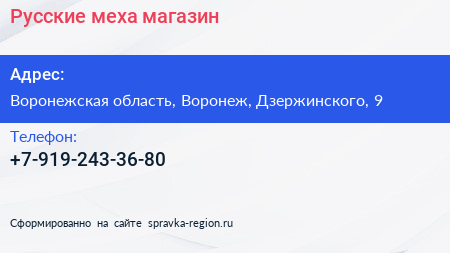 Русские меха, магазин по адресу Воронежская область, Воронеж, Дзержинского, 9 в дальнейшем Организация, размещена в следующих категориях: