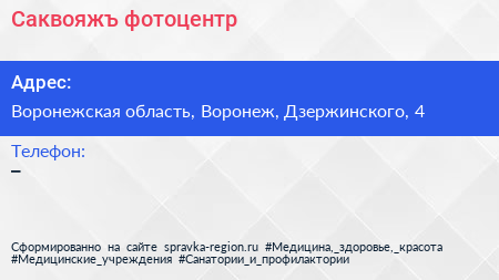 Саквояжъ, фотоцентр по адресу Воронежская область, Воронеж, Дзержинского, 4 в дальнейшем Организация, размещена в следующих категориях: