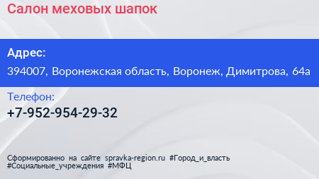 Салон меховых шапок по адресу 394007, Воронежская область, Воронеж, Димитрова, 64а в дальнейшем Организация, размещена в следующих категориях: