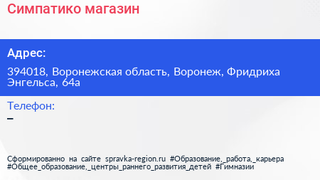 Симпатико, магазин по адресу 394018, Воронежская область, Воронеж, Фридриха Энгельса, 64а в дальнейшем Организация, размещена в следующих категориях: