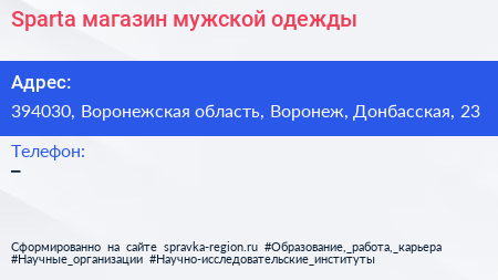 Sparta, магазин мужской одежды по адресу 394030, Воронежская область, Воронеж, Донбасская, 23 в дальнейшем Организация, размещена в следующих категориях: