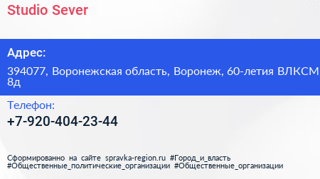 Studio Sever по адресу 394077, Воронежская область, Воронеж, 60-летия ВЛКСМ, 8д в дальнейшем Организация, размещена в следующих категориях:
