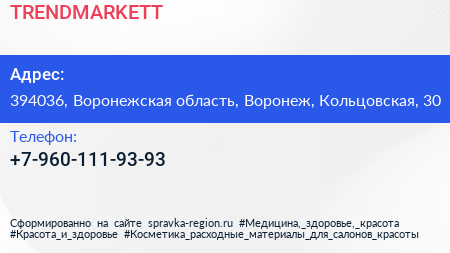 TRENDMARKETT по адресу 394036, Воронежская область, Воронеж, Кольцовская, 30 в дальнейшем Организация, размещена в следующих категориях: