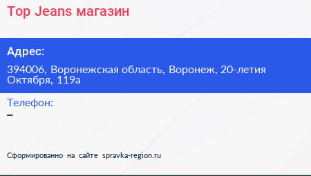 Top Jeans, магазин по адресу 394006, Воронежская область, Воронеж, 20-летия Октября, 119а в дальнейшем Организация, размещена в следующих категориях: