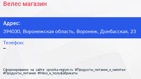 Велес, магазин по адресу 394030, Воронежская область, Воронеж, Донбасская, 23 в дальнейшем Организация, размещена в следующих категориях: