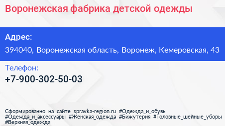 Воронежская фабрика детской одежды по адресу 394040, Воронежская область, Воронеж, Кемеровская, 43 в дальнейшем Организация, размещена в следующих категориях: