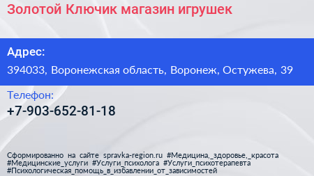Золотой Ключик, магазин игрушек по адресу 394033, Воронежская область, Воронеж, Остужева, 39 в дальнейшем Организация, размещена в следующих категориях: