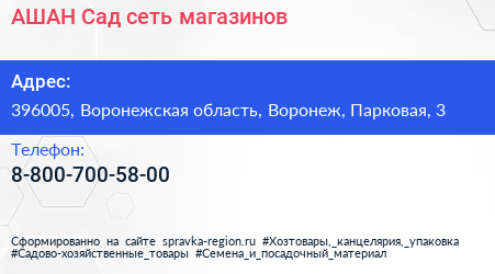 АШАН Сад, сеть магазинов по адресу 396005, Воронежская область, Воронеж, Парковая, 3 в дальнейшем Организация, размещена в следующих категориях:
