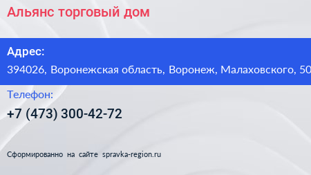 Альянс, торговый дом по адресу 394026, Воронежская область, Воронеж, Малаховского, 50 в дальнейшем Организация, размещена в следующих категориях: