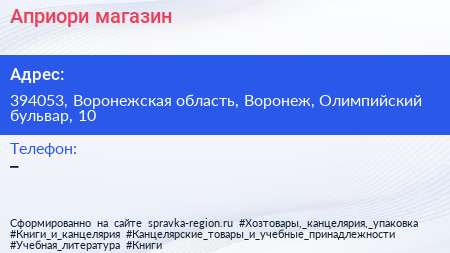 Априори, магазин по адресу 394053, Воронежская область, Воронеж, Олимпийский бульвар, 10 в дальнейшем Организация, размещена в следующих категориях: