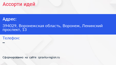 Ассорти идей по адресу 394029, Воронежская область, Воронеж, Ленинский проспект, 13 в дальнейшем Организация, размещена в следующих категориях: