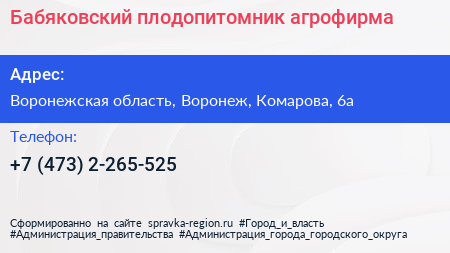 Бабяковский плодопитомник, агрофирма по адресу Воронежская область, Воронеж, Комарова, 6а в дальнейшем Организация, размещена в следующих категориях: