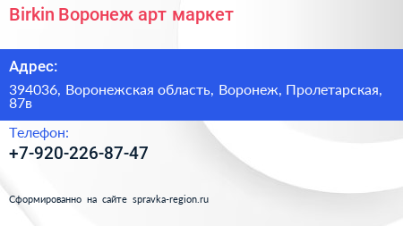 Birkin Воронеж, арт-маркет по адресу 394036, Воронежская область, Воронеж, Пролетарская, 87в в дальнейшем Организация, размещена в следующих категориях: