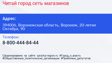 Читай-город, сеть магазинов по адресу 394006, Воронежская область, Воронеж, 20-летия Октября, 90 в дальнейшем Организация, размещена в следующих категориях: