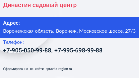 Династия, садовый центр по адресу Воронежская область, Воронеж, Московское шоссе, 27/3 в дальнейшем Организация, размещена в следующих категориях: