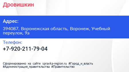 Дровишкин по адресу 394087, Воронежская область, Воронеж, Учебный переулок, 9а в дальнейшем Организация, размещена в следующих категориях: