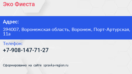 Эко Фиеста по адресу 394007, Воронежская область, Воронеж, Порт-Артурская, 11а в дальнейшем Организация, размещена в следующих категориях:
