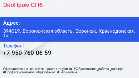 ЭкоПром СПб по адресу 394019, Воронежская область, Воронеж, Краснодонская, 1а в дальнейшем Организация, размещена в следующих категориях: