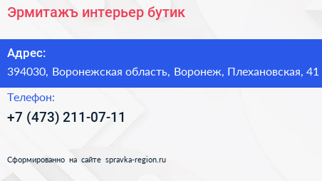 Эрмитажъ, интерьер-бутик по адресу 394030, Воронежская область, Воронеж, Плехановская, 41 в дальнейшем Организация, размещена в следующих категориях:
