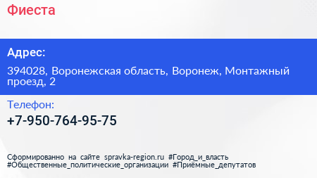 Фиеста по адресу 394028, Воронежская область, Воронеж, Монтажный проезд, 2 в дальнейшем Организация, размещена в следующих категориях: