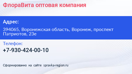 ФлораВита, оптовая компания по адресу 394065, Воронежская область, Воронеж, проспект Патриотов, 23е в дальнейшем Организация, размещена в следующих категориях: