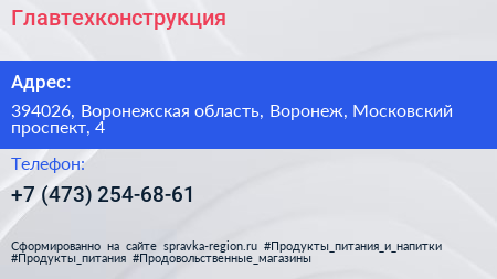 Главтехконструкция по адресу 394026, Воронежская область, Воронеж, Московский проспект, 4 в дальнейшем Организация, размещена в следующих категориях: