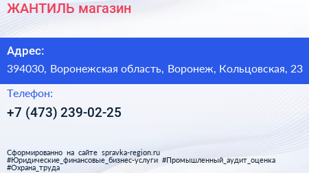 ЖАНТИЛЬ, магазин по адресу 394030, Воронежская область, Воронеж, Кольцовская, 23 в дальнейшем Организация, размещена в следующих категориях: