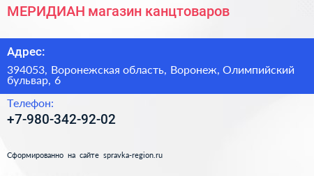 МЕРИДИАН, магазин канцтоваров по адресу 394053, Воронежская область, Воронеж, Олимпийский бульвар, 6 в дальнейшем Организация, размещена в следующих категориях:
