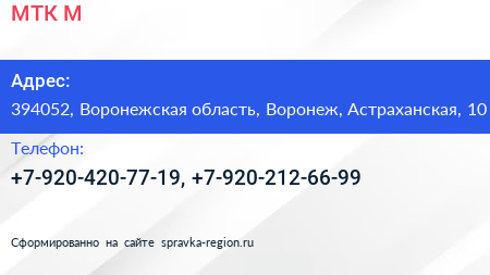 МТК-М по адресу 394052, Воронежская область, Воронеж, Астраханская, 10 в дальнейшем Организация, размещена в следующих категориях: