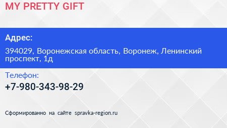 MY PRETTY GIFT по адресу 394029, Воронежская область, Воронеж, Ленинский проспект, 1д в дальнейшем Организация, размещена в следующих категориях: