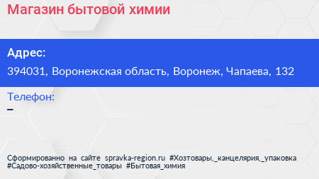 Магазин бытовой химии по адресу 394031, Воронежская область, Воронеж, Чапаева, 132 в дальнейшем Организация, размещена в следующих категориях: